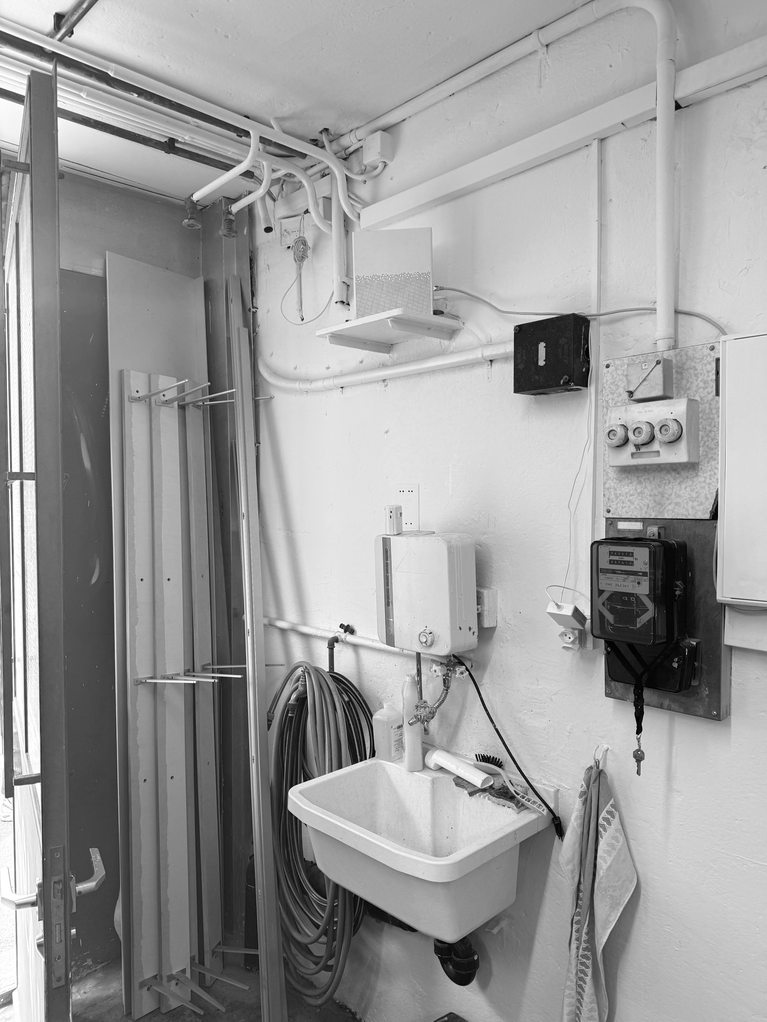 Die Transformation der ehemaligen Spenglerei wurde in einem kompakten Zeitraum von nur einem Monat vom Entwurf über die Ausführungsplanung bis zum Umzug realisiert. Diese Verdichtung der Prozesse verlangte eine enge Verzahnung von Planung und handwerklicher Umsetzung. Sämtliche handwerklichen Arbeiten wurden von Studio Aftermidnight ausgeführt, mit dem Raumtakt in einem dialogischen Prozess Materialien, Oberflächen und Detaillierungen entwickelte. Der Ausbau versteht sich als präzise Intervention mit wenigen, klar gesetzten Elementen wie raumbildenden Einbauten, gezielt geführtem Licht und einer zurückhaltenden, auf Langlebigkeit angelegten Materialpalette, die den Bestand transformiert, ohne seine Geschichte zu überdecken.