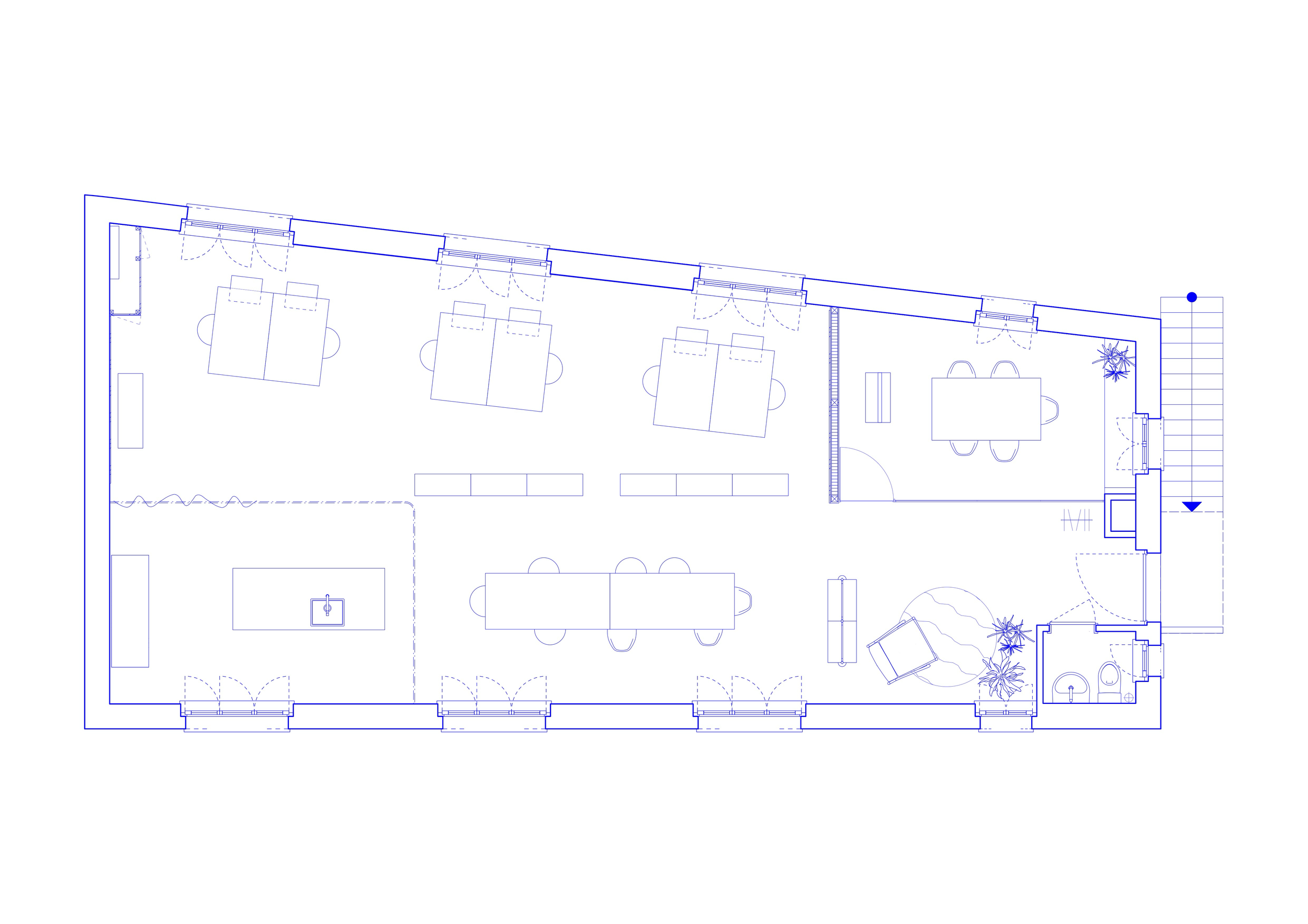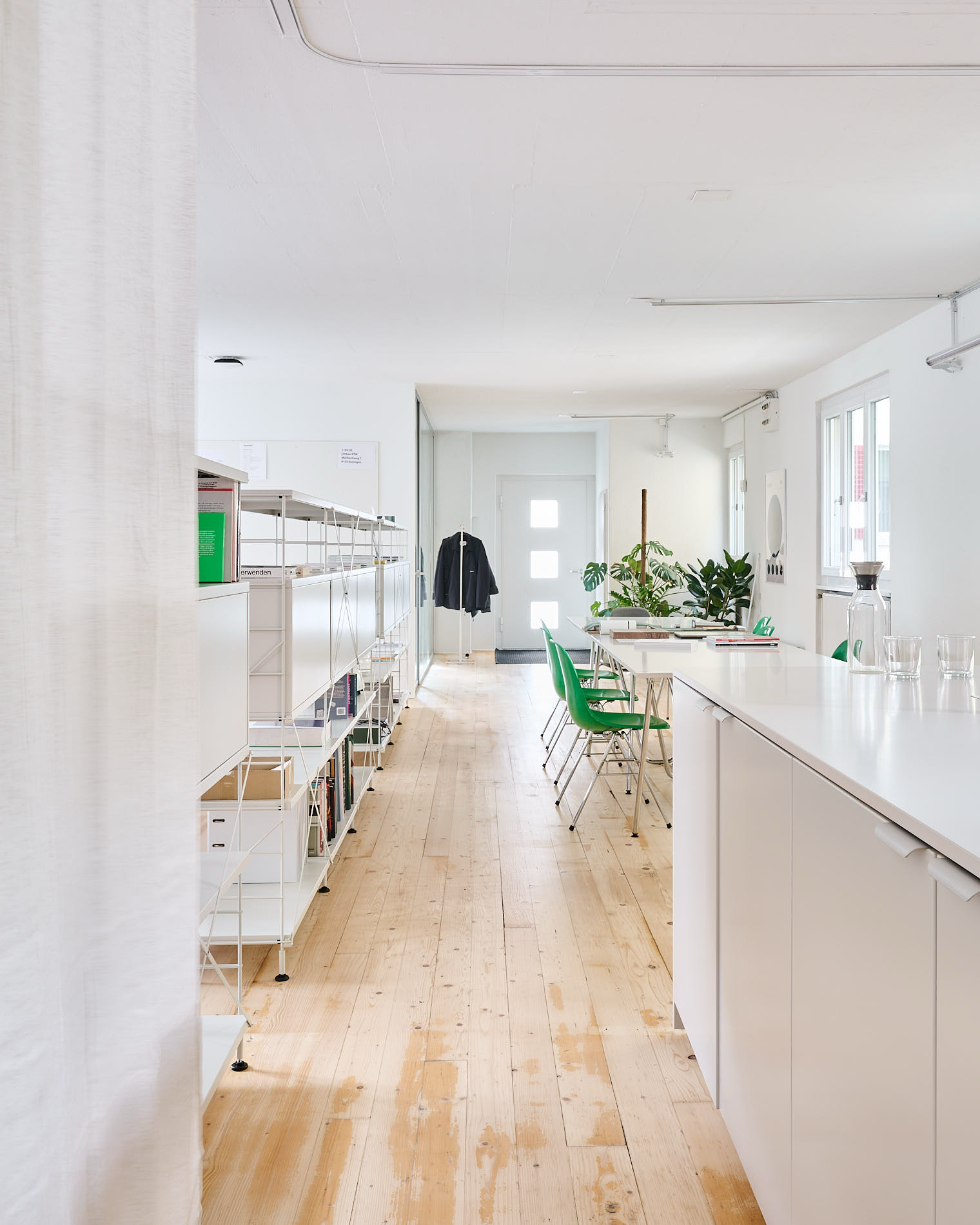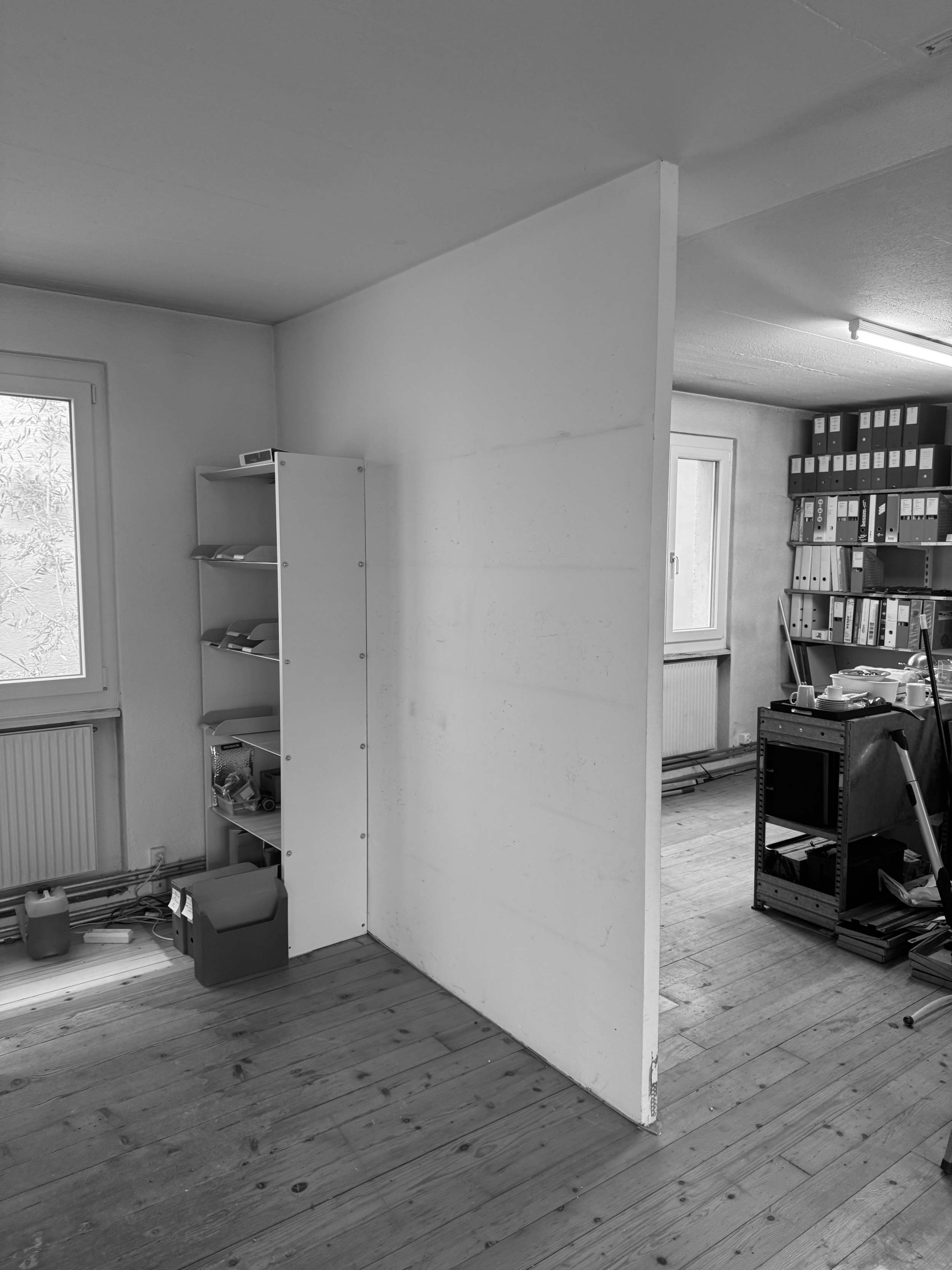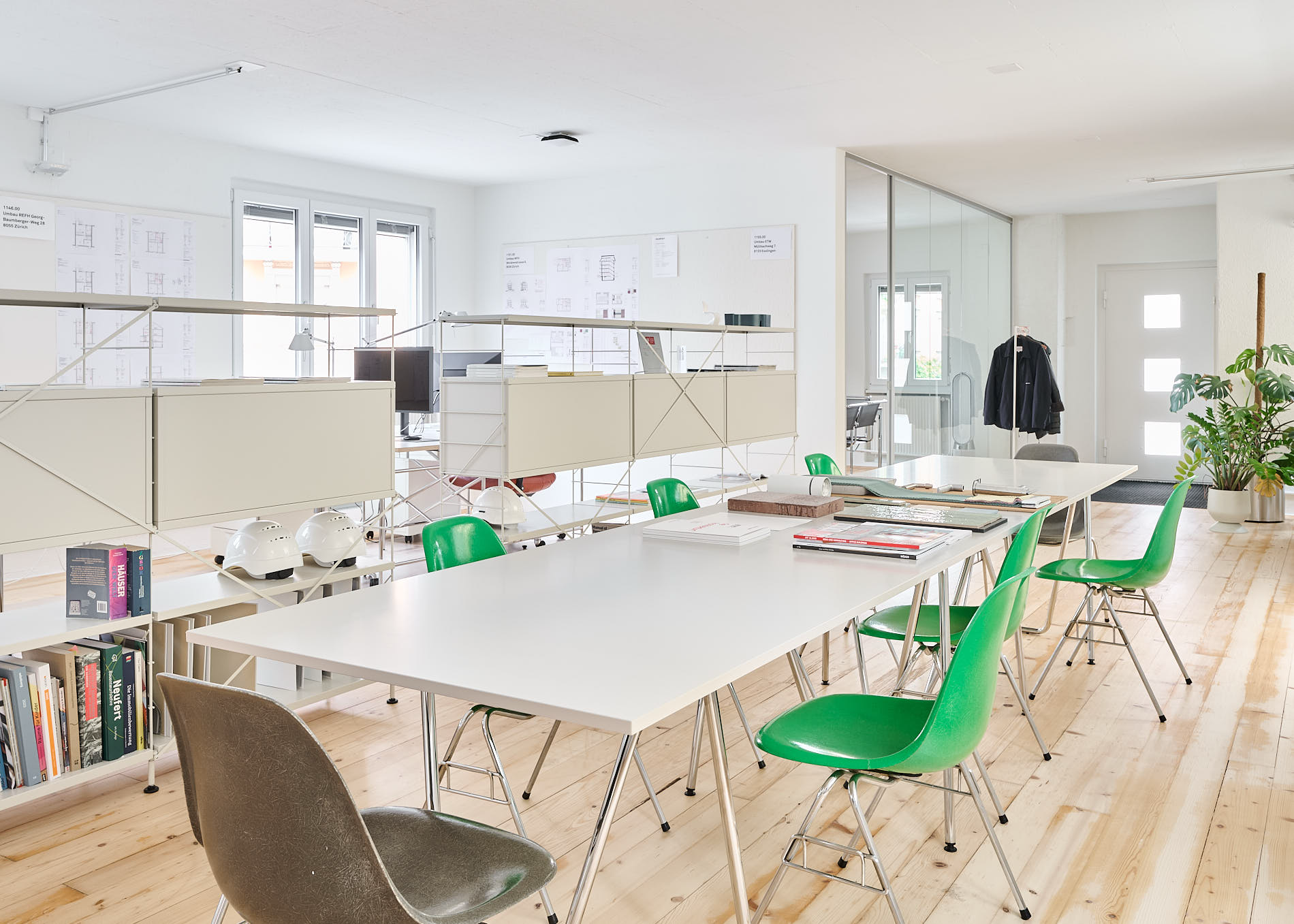 Die neue Bürofläche von rund 120 m² liegt im Obergeschoss eines Bestandsbaus mit industrieller Prägung. Der räumliche Charakter mit tiefen Grundrissen, tragenden Strukturen und sichtbaren Installationen wurde nicht kaschiert, sondern als Ausgangspunkt für die Transformation zum Studio genutzt. Anstelle eines radikalen Ausbaus stand die präzise Bearbeitung des Vorgefundenen im Vordergrund. Der Bestand wurde in Zonen gegliedert: offene Arbeitslandschaften, konzentrierte Projektbereiche, Flächen für Material- und Modellarbeit sowie eine gemeinsame Mitte für Besprechung, Austausch und Aneignung im Alltag.