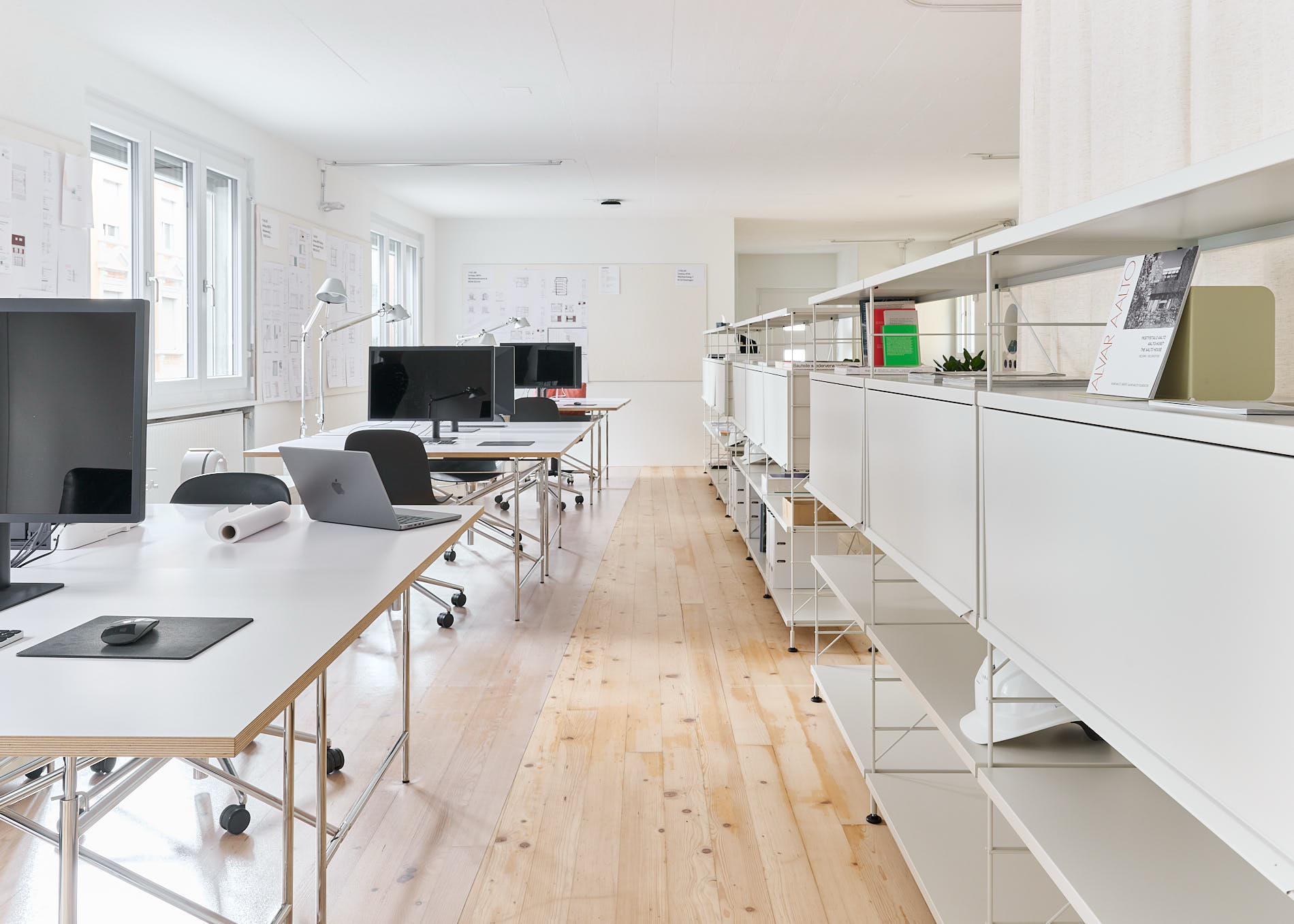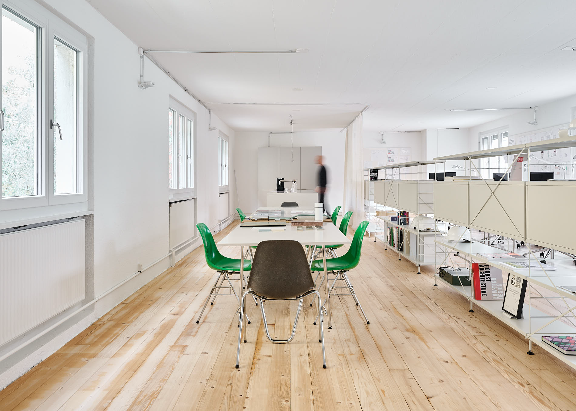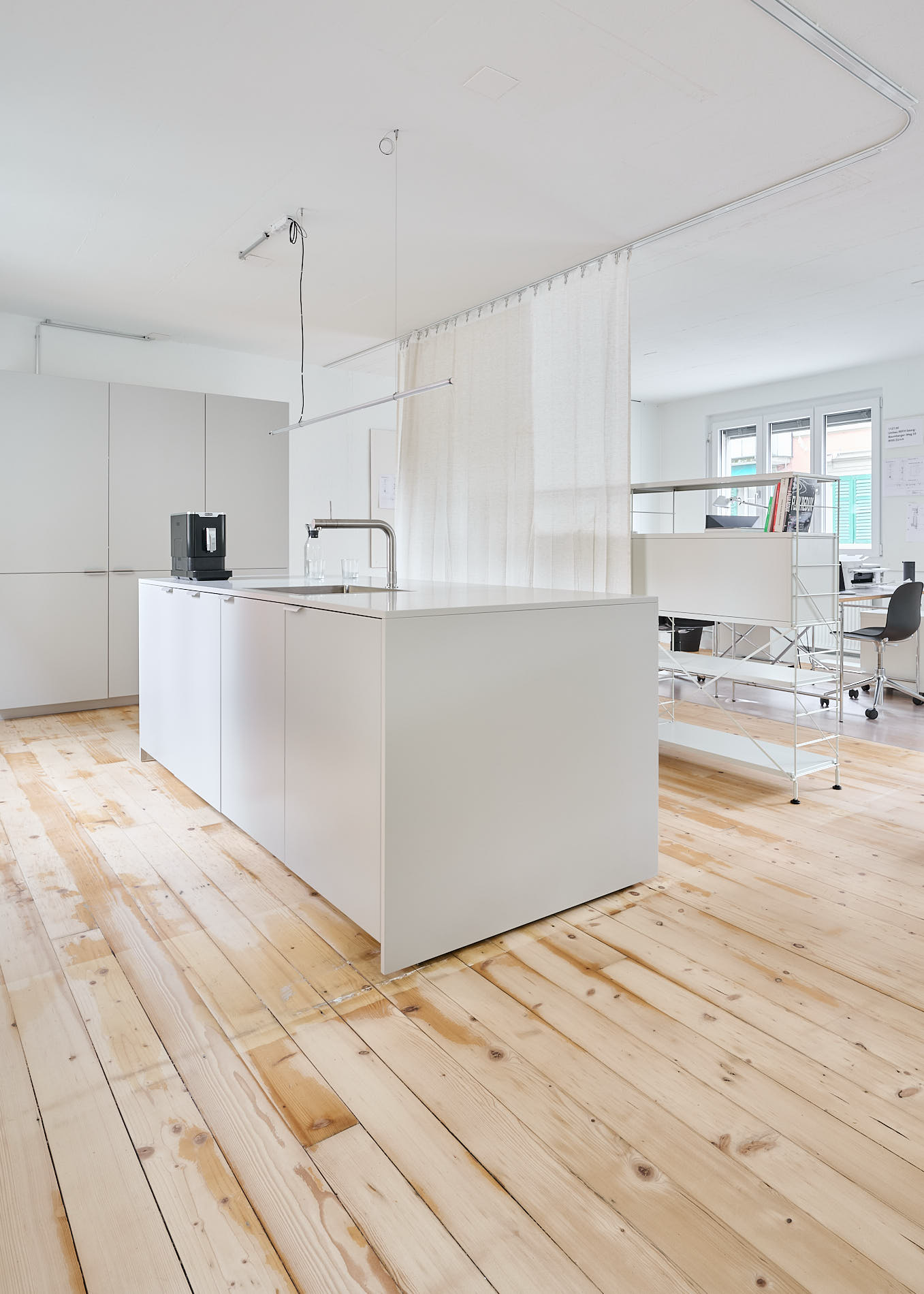 Das Head Office versteht sich als räumliches Manifest der Arbeitsweise von Raumtakt. Flexible, nicht hierarchisierte Arbeitsplätze, mobile Möblierungen, im Detail sorgfältig ausgearbeitete Einbauten erlauben es, Projektteams und Nutzungsmodi schnell zu rekonfigurieren. Die Organisation des Grundrisses folgt weniger einer klassischen Bürotypologie als der Logik eines Ateliers, in dem analoge Modelle, Pläne und Materialproben ebenso selbstverständlich präsent sind wie digitale Arbeitsplätze. Der Raum dient der Produktion und zugleich der Kommunikation von Projekten nach innen und aussen.